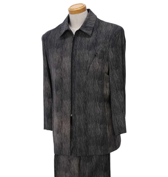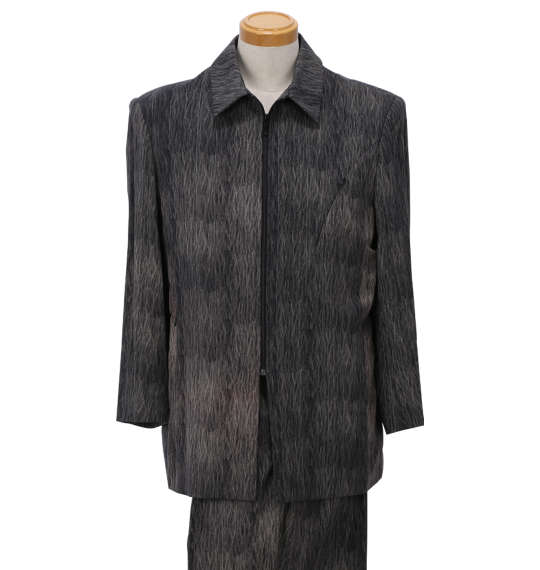 | スーツです。 ジャケット:背抜き/ノーベント/胸・サイド・内ポケット有/フルジップ パンツ:前開きファスナー/ゴム(ウエストサイド)/サイド・バックポケット有/ツータック/ベルトループ5本 プリント/日本製 |