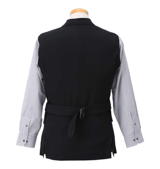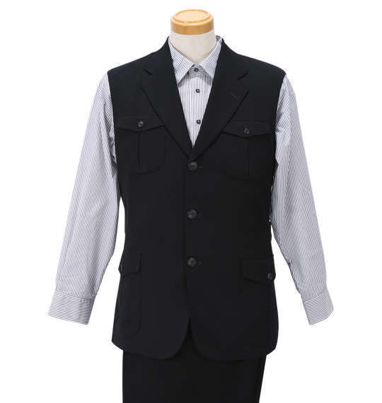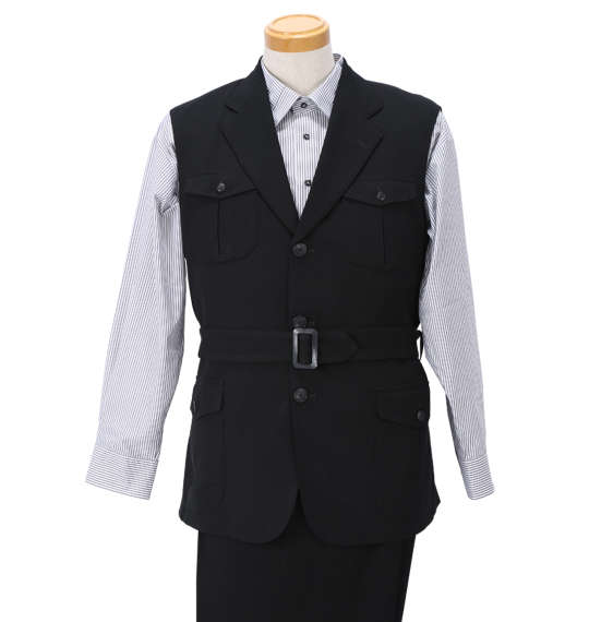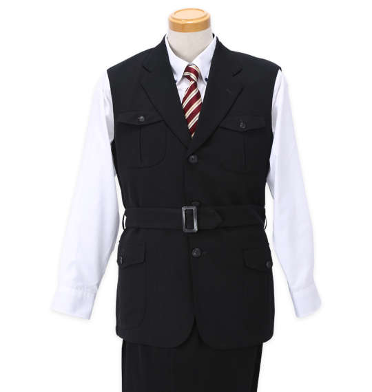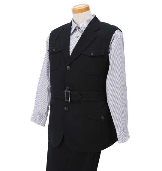 | 袖無しデザインスーツです。 ジャケット:背抜き/サイドベント/胸・サイド・内ポケット有/ウエストベルト パンツ:前開きファスナー/サイド・バックポケット有/ツータック/ベルトループ8本 日本製 |