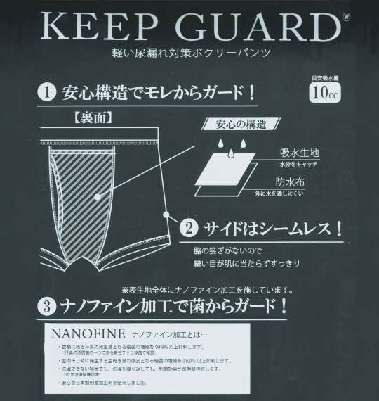 | KEEP GUARDのナノファイン100加工軽失禁対策ボクサーパンツです。 バレずにかっこよく尿漏れケアができ、ちょっとした不安に寄り添ってくれる頼もしいパンツ。 使いやすい無地とオシャレなプリント柄のラインナップで、日常使いしやすいデザインです。 【特長】 POINT1 安心構造でモレからガード 吸水生地で水分をキャッチし、外に水を通しにくい防水布でモレをガードします。 POINT2 サイドはシームレス 脇の縫い目がないので、縫い目が肌に当たらずスッキリ。 POINT3 ナノファイン加工で菌からガード ナノファイン加工により、衣類に残る汗臭の発生源となる細菌や、室内干し時に発生する生乾き臭の原因となる細菌の増殖を99.9%以上抑制します。 洗濯を繰り返しても、制菌効果が長時間持続します。 【サイズについて】 サイズ表のウエストサイズは適応範囲となります。 【商品について】 漏れる量や位置によっては、目安給水量:10cc 未満でもパンツ表地に滲み出る場合がございます。 前開き/ボクサータイプ/ストレッチ/吸水性(パッド部分)/ナノファイン制菌加工/抗菌防臭/目安吸水量10cc 【返品交換について】開封前なら返品交換できます。 |