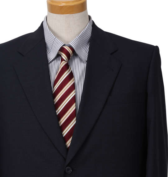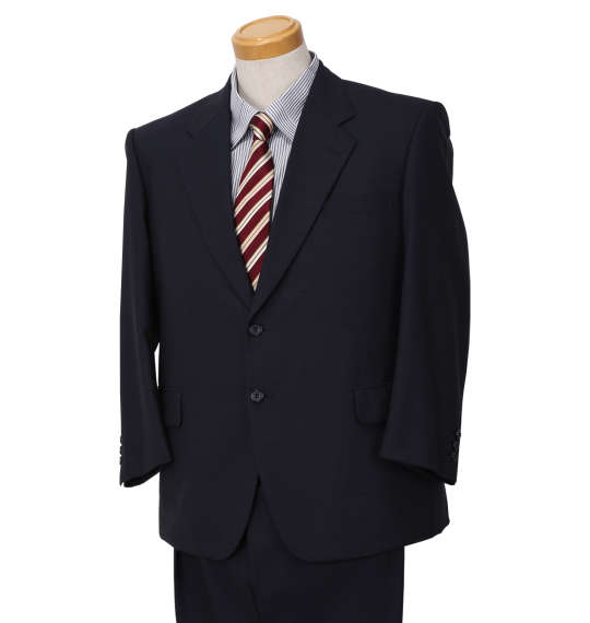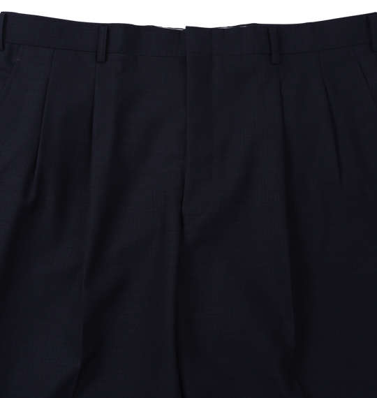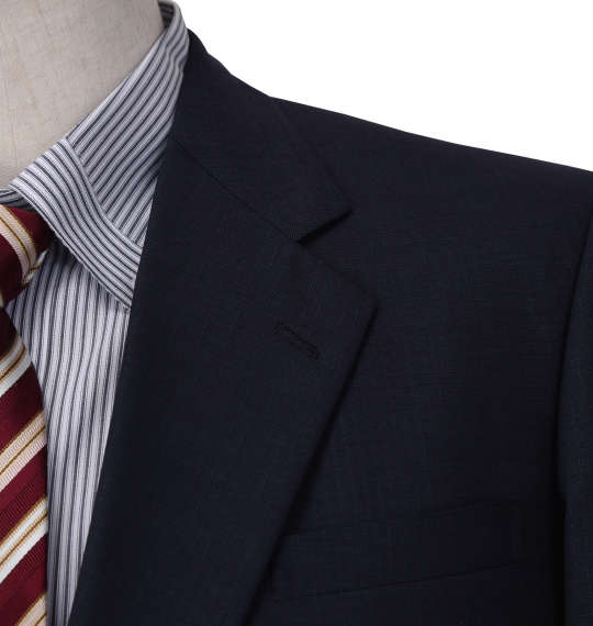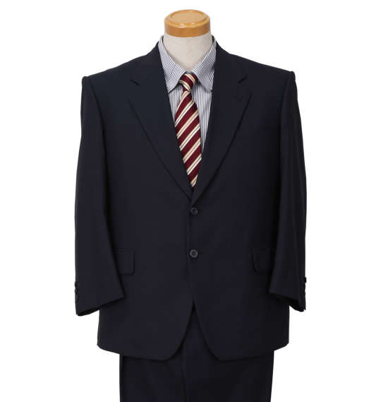 | スーツ(2パンツ)です。 ジャケット:背抜き/ノーベント/胸・サイド・内ポケット有/フラワーホール パンツ:前開きファスナー/サイド・バックポケット有/ツータック/ベルトループ8本 |