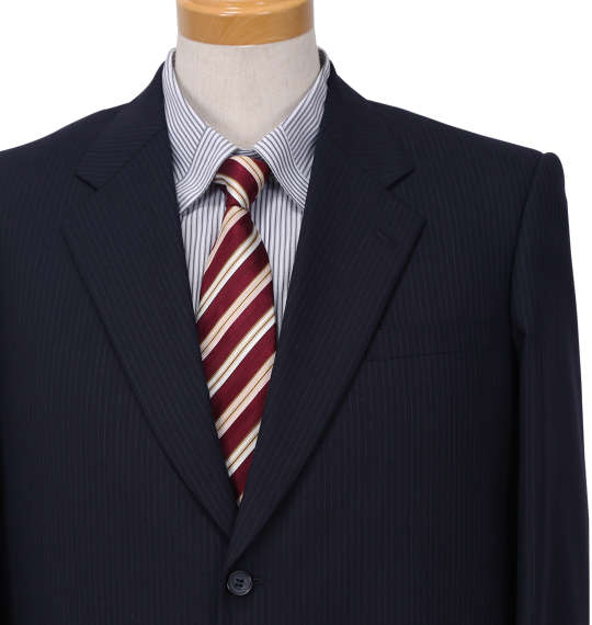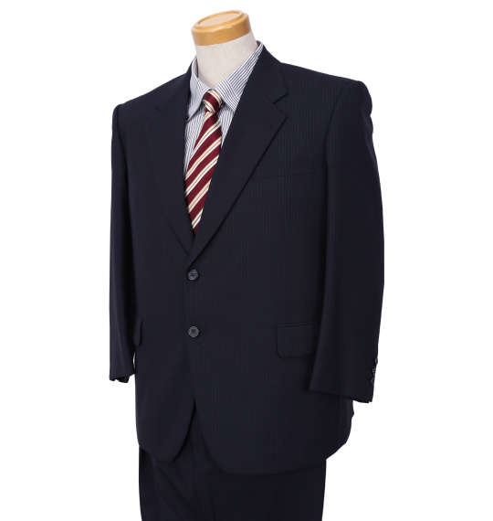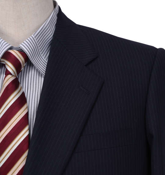 | スーツ(2パンツ)です。 ジャケット:背抜き/ノーベント/胸・サイド・内ポケット有/フラワーホール パンツ:前開きファスナー/サイド・バックポケット有/ツータック/ベルトループ8本 |